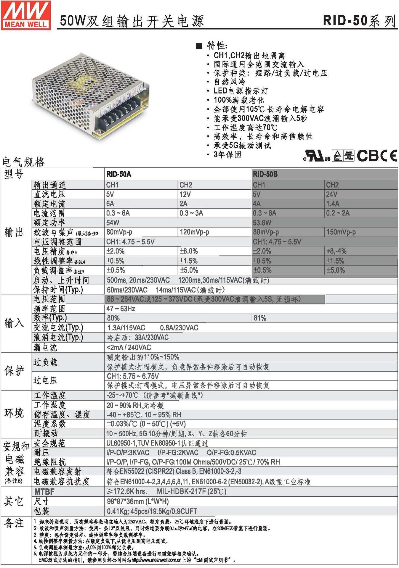 电磁兼容标准 发射:EN55022(CISPR22) class B 谐波:EN61000-3-2,-3