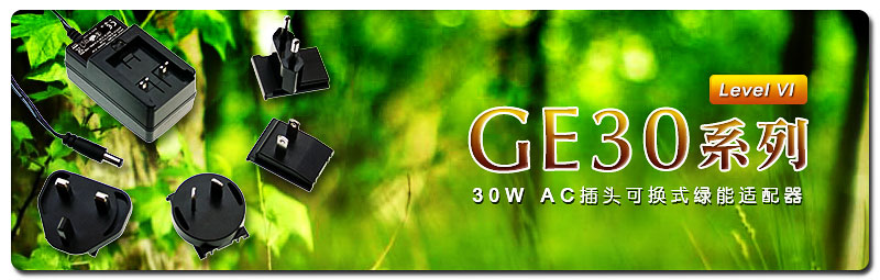 继GE12/18/24系列後,今年会新上市30W插墙式AC插头可互换之节能适配器~GE30系列。本产品电源本体可搭配欧、美、英、澳等四种AC插头互换,於全球各国使用时可轻易更换适当之AC插头。GE30系列符合国际最新能耗标准(EISA 2007/DoE Level VI)及欧盟ErP指令,是一款高品质、高寿命并兼具节能的工业等级适配器,非常适合使用於各式各样消费性电子产品、商旅人士随身可携带电子装置或需求AC可换头电源供应器来搭配电子设备行销世界各国的系统方案。